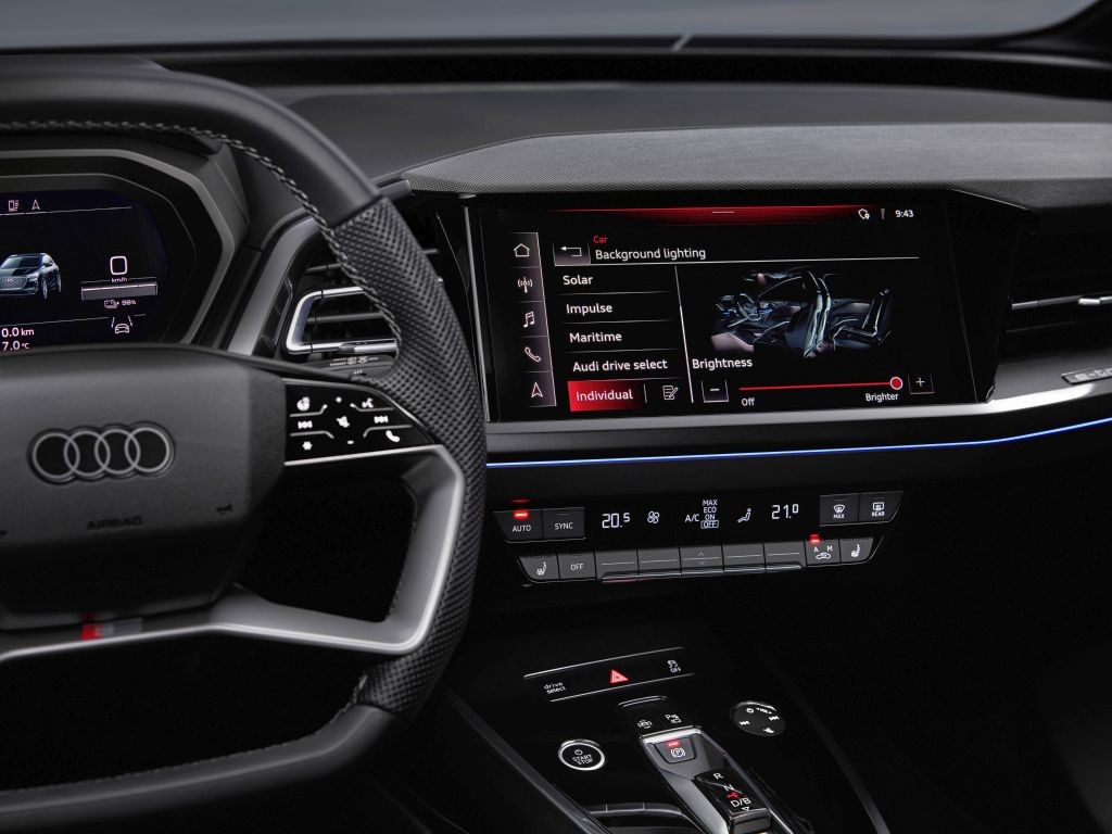 Popolnoma nov je tudi volan z neprekinjenimi površinami na dotik, prek katerih voznik krmili digitalni kombinirani inštrument. Infotainment sistem in navigacija se primarno upravljata prek osrednjega zaslona na dotik MMI touch, ki bo proti koncu leta na voljo tudi v največji 11,6-palčni različici. Upravljanje z naravnim jezikom (ni na voljo v slovenskem jeziku) predstavlja tretji upravljalni nivo. Po želji sta Audi Q4 e-tron in Q4 Sportback e-tron opremljena še z eno novostjo – projicirnim zaslonom s tehnologijo obogatene resničnosti. Napotke nekaterih asistenčnih sistemov in navigacijske simbole ustrezno projicira v resnični zunanji svet, tako da so v vidnem polju voznika. Dinamično se projicirajo na večjo površino. Zdi se, da virtualno lebdijo na razdalji pribl. 10 metrov ali več od voznika – fascinanten učinek.