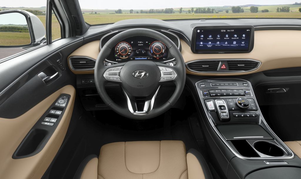 Notranjost novega Santa Fe je v primerjavi s prejšnjim modelom prostornejša, udobnejša in še boj praktična. Obenem vse njene komponente odlikujejo kakovostni, na otip mehki materiali, ki poskrbijo za pridih razkošja. Armaturna plošča je postavljena nekoliko nižje, osrednja konzola se ponaša z novim slogom, v središču pa blesti 10,25-palčni zaslon na dotik. Lebdeča osrednja konzola gosti gumbe za upravljanje s samodejnim menjalnikom, njene poteze pa se elegantno zlivajo z zgornjim delom
