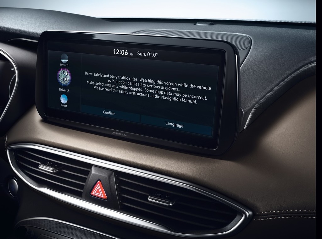 Na voljo sta tudi storitvi Apple CarPlay in Android Auto, ki v povezavi z infozabavnim sistemom omogočata tudi brezžično povezavo pametnega telefona z vozilom. Prav tako je nadgrajen sistem za brezžično polnjenje mobilnih naprav v osrednji konzoli, ki sedaj omogoča napajanje z močjo 15 vatov, vhod USB pa je odslej na voljo tudi potnikom zadaj. Za še več personalizacije poskrbi sistem za glasovno upravljanje, upravljanje samodejnega menjalnika s pomočjo gumbov pa zagotavlja še preprostejše prestavljanje. Tako kot Santa Fe prejšnje generacije je tudi najnovejši model opremljen s projekcijskim zaslonom head-up, ki podatke o vožnji projicira naravnost na vetrobransko steklo. S tem vozniku omogoča, da ves čas spremlja ključne informacije, kot so hitrost, navodila navigacijskega sistema in varnostna opozorila, pri tem pa ne odmika pogleda s cestišča. Projekcijsko polje zavzema površino diagonale 8 palcev, s svetilnostjo nad 10.000 kandel na kvadratni meter pa v vseh svetlobnih pogojih zagotavlja odlično berljivost. Višina in kot projekcije sta prilagodljiva.