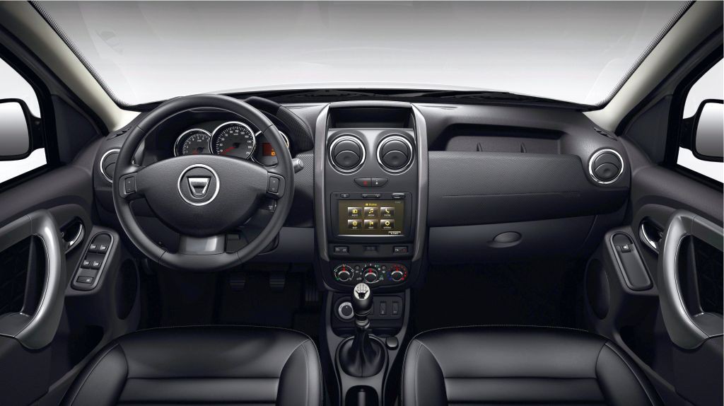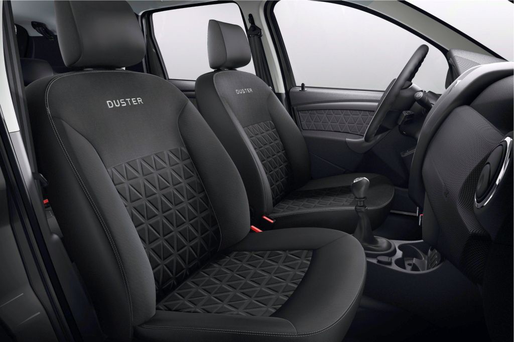Armaturna plošča je popolnoma preoblikovana. Osrednjo konzolo obrobljata pokončna strukturna elementa, ki poudarjata čvrst značaj celote. Temnejše barve notranje opreme poudarjajo krepek značaj Dusterja in njegovo pripadnost svetu terencev. Za boljše udobje poskrbijo na novo oblikovani sedeži in okrepljen naslon zadnje sedežne klopi. Dacia Duster je na voljo s štirimi novimi vrstami prevlek vključno z usnjenimi. Novi Dacia Duster na zunaj in znotraj potrjuje svoj slog avtomobila za vsa