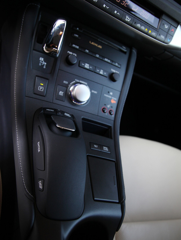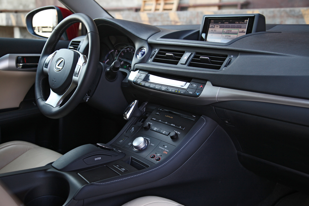 Za razliko od omenjenih je CT hibrid, ki uporablja enak pogonski sklop kot prius, vendar s spremenjenim režimom delovanja, ki bolj ustreza živahno nastrojenemu karakterju. Voznik lahko spreminja delovanje motorja s pomočjo vrtljivega stikala in izbira med eco, normal in načinom sport, pri katerem je vsa moč hitreje na voljo. Pri premiku stikala na sport se merilniki obarvajo rdeče, indikator porabe energije pa takrat izgine in ga zamenja merilnik vrtljajev. Voznik se lahko med radiem, navigacijsko napravo in ostalimi elementi sprehaja s pomočjo miški podobnega vmesnika, ki smo ga srečali že v večjem RX-u in je sila prijeten za uporabo.