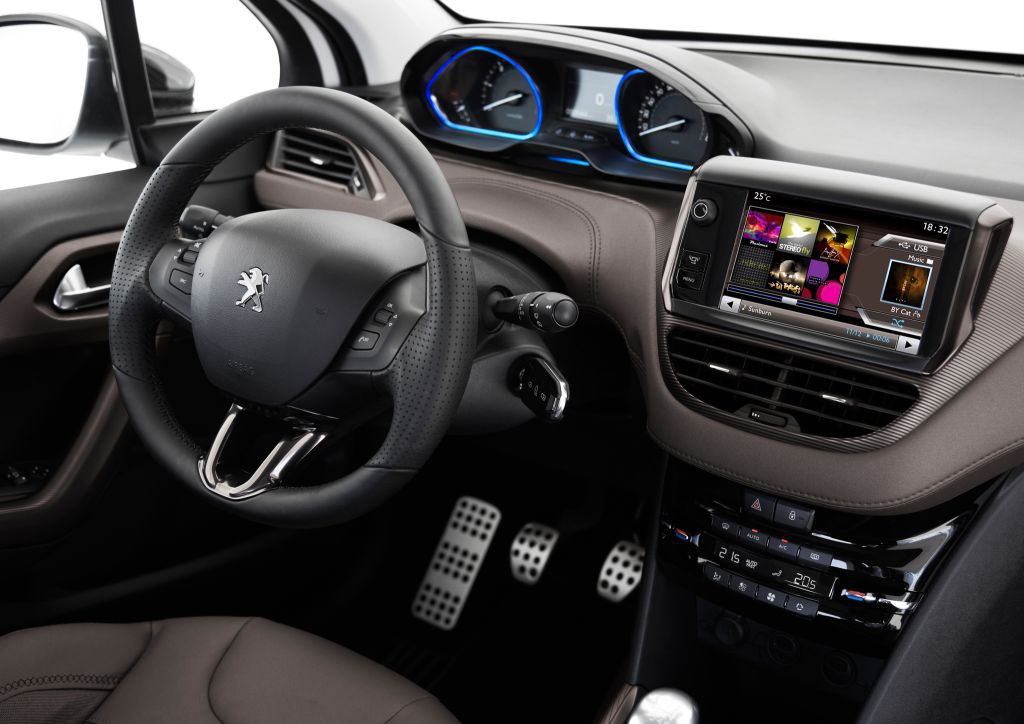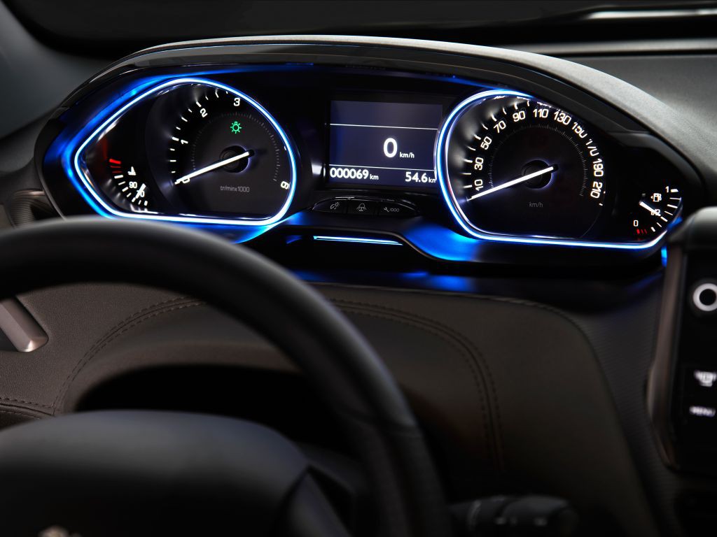 Na srednje visoki osrednji konzoli, ki se vzpenja od vznožja armaturne plošče, ima na dosegu roke ročno zavoro "letalskega" tipa z ročico v obliki ročaja, ki na voznikovem mestu sprosti še več prostora. Elegantna in vzdržljiva ročica je pri bogatejših izvedenkah prekrita z usnjem z okrasnimi šivi. Na konzoli najdemo tudi stikalo za nastavitev senčnika panoramske steklene strehe v neposredni bližini vrtljivega gumba sistema Grip Control. Obroba armaturne plošče je obdana z na otip svilnatim materialom, ki vabi k dotiku. Prostor dodatno poživijo nesvetleči kromani dodatki: zračniki, ročica ročne zavore, spodnji dekorativni profil volana manjših dimenzij, utori ročaja prestavne ročice, okrasne obrobe zaslona na dotik. Ambienta za volanom ni možno primerjati z ničemer drugim, za kar ima zasluge posebna osvetlitev: merilniki v višini oči, ki imajo pri višjih izvedenkah ozadje osvetljeno z LED diodami v modrem odtenku in panoramska steklena streha z vodili z LED diodami v modri barvi. Tudi različica 2008 z nezastekljeno streho ima edinstven svetlobni izraz. Med inovacije štejemo tudi notranjo površino strehe z lasersko vgraviranimi motivi precizne oblike. Ponoči je notranjost strehe Peugeot LED Track osvetljena s pritajeno belo svetlobo, ki jo oddajajo LED diode.