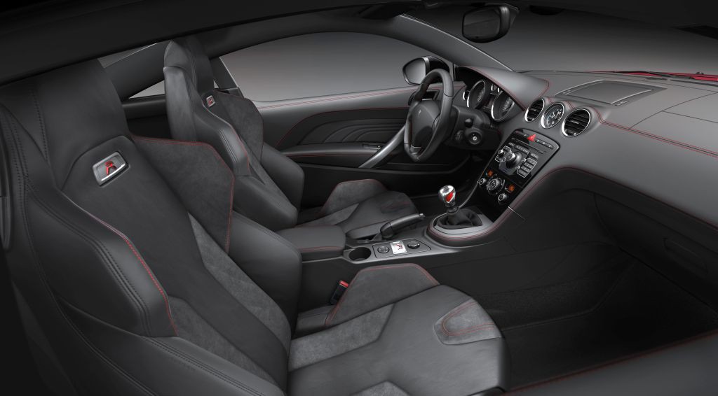 kombinacijo črnega polnega zrnastega usnja Napa ter črne alcantare ter nosijo monogram "R". Kromana in z rdečo obrobljena črka "R" je videti, kot bi izstopala iz plošče s prevleko iz brušenega aluminija s štirimi vijaki, ki krasi sredinsko konzolo. Po navdihu letalstva simbolizira natančnost in elegantno nosi pečat Peugeot Sport.