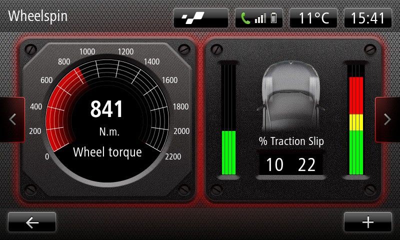 - Navor in moč motorja, temperaturi hladilne tekočine in sesanega zraka, tlak turbo puhala, položaj lopute za plin, pritisk na zavoro, volanski kot, število vrtljajev, temperatura olja v menjalniku in sklopk EDC, navor na kolesih itn.