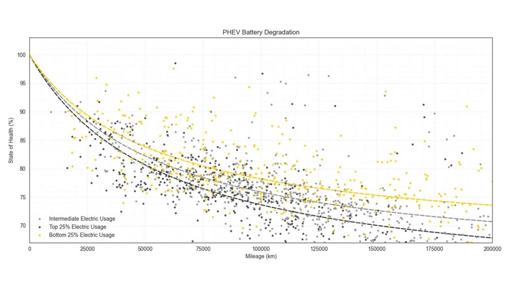 Povsem logično je, da je stopnja degradacije akumulatorjev odvisna od tega kako pogosto se uporabniki priključnih hibridov premikajo samo ob pomoči elektrike, zato strokovnjaki odsvetujejo nakup priključnega hibrida vsem tistim, ki želijo ob pomoči elektrike prevoziti večje število kilometrov. Za takšne uporabnike je bolje, da si omislijo nakup striktno električno gnanega avtomobila. Kot najboljše pa omenjajo akumulatorje, ki so v priključnih hibridih znamke Mercedes-Benz, ker je njihova degradacija zelo majhna vse do približno 200.000 prevoženih kilometrov. Tega pa ne moremo reči za akumulatorje v vozilih znamke BMW, kjer je njihova dolgoživost odvisna predvsem od pogostosti uporabe električnega pogona. V tem pogledu so na boljšem lastniki priključnih hibridov znamke Volvo in priključnih hibridov iz skupine Volkswagen, ker je njihova degradacija manjša tudi pri velikem številu prevoženih kilometrov. Manj so bili Nemci in Avstrijci navdušeni nad akumulatorji v priključnih hibridih znamke Ford, kjer je prišlo do občutne degradacije že po samo 75.000 prevoženih kilometrih. Zanimivo pa je obnašanje akumulatorjev pri vozilih znamke Mitsubishi, kjer je degradacija zelo izrazita na začetku njihove življenjske poti, kasneje pa se 'stabilizirajo'.