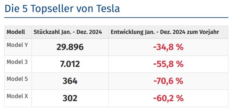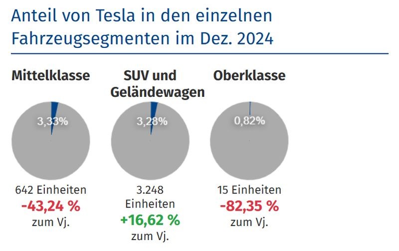 Največji upad prodaje na nemškem tržišču v lanskem letu je doživel model S (-70,6 %), podobno velja tudi za model X (-60,2 %), sledita pa še modela 3 (-55,8 %) in Y (-34,8 %), posledično je tržni delež znamke Tesla na nemškem tržišču v lanskem decembru doživel občutni padec, sploh v 'Oberklasse' segmentu (-82,35 %), ker so Nemcem dostavili samo 15 novih primerkov modela S in pa v srednjerazrednem (D) segmentu (-43,24 %, prodanih 642 novih vozil), dvig prodaje so zaznali samo v SUV segmentu (+16,62 %), ker so Nemcem in Nemkam v lanskem decembru dostavili 3.248 novih vozil.