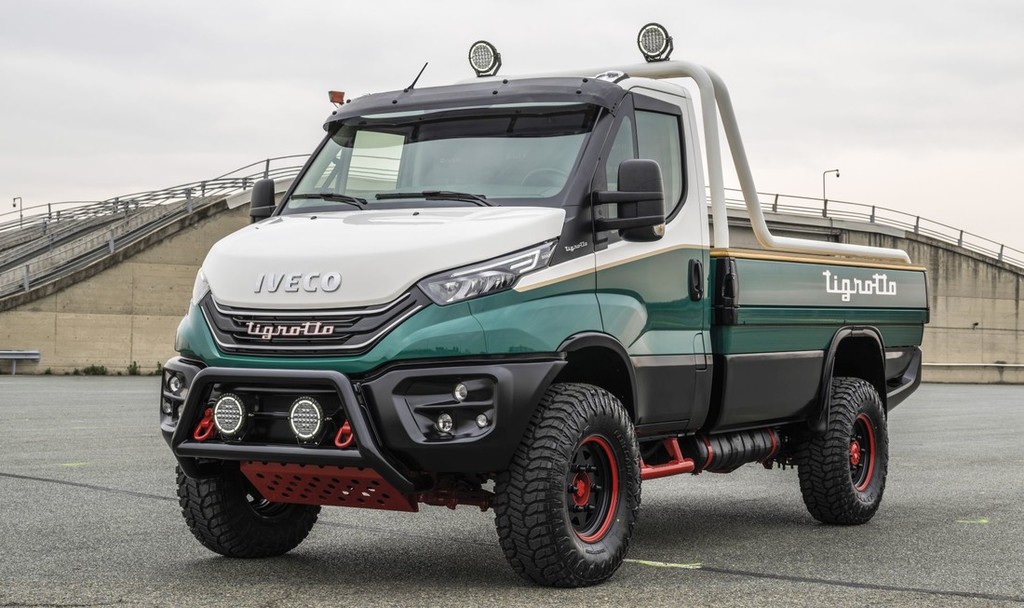 Tako smo sedaj na osnovi aktualnega serijskega modela daily v različici 4x4 dobili prototipno ‘lifestyle’ različico ‘Tigrotto’ (tigrček), ki se lahko pohvali z dodatno dvignjenim podvozjem, še večjimi kolesi, večbarvno karoserijo ter modificirano notranjostjo potniške kabine, seveda po okusu bolj razvajenih potnikov. Tako med vgrajeno opremo omenjajo sedeže, ki so oblečeni v usnje ter tribarvno armaturno ploščo ter večjo količino pravega lesa, ki pa jo niso uporabili ob opremljanju potniške kabine, temveč ob prekrivanju dna tovornega prostora. Pod motornim pokrovom te ‘premijske’ in najbrž tudi ‘športne’ (glede na zmedeno dojemanje današnjega marketinga …) različice modela daily se skriva serijski ‘traktorski’ pogonski sklop (tip F1C.129-Diesel), ki lahko ponudi uporabniku 176 KM (129 kW) pogonske moči ter 430 Nm motornega navora. Glede na nameščene pnevmatike in odmaknjenost dna karoserije od vozne podlage lahko od takšnega vozila najbrž pričakujemo dobre ‘plezalne sposobnosti’ ob vožnji izven urejenih površin.