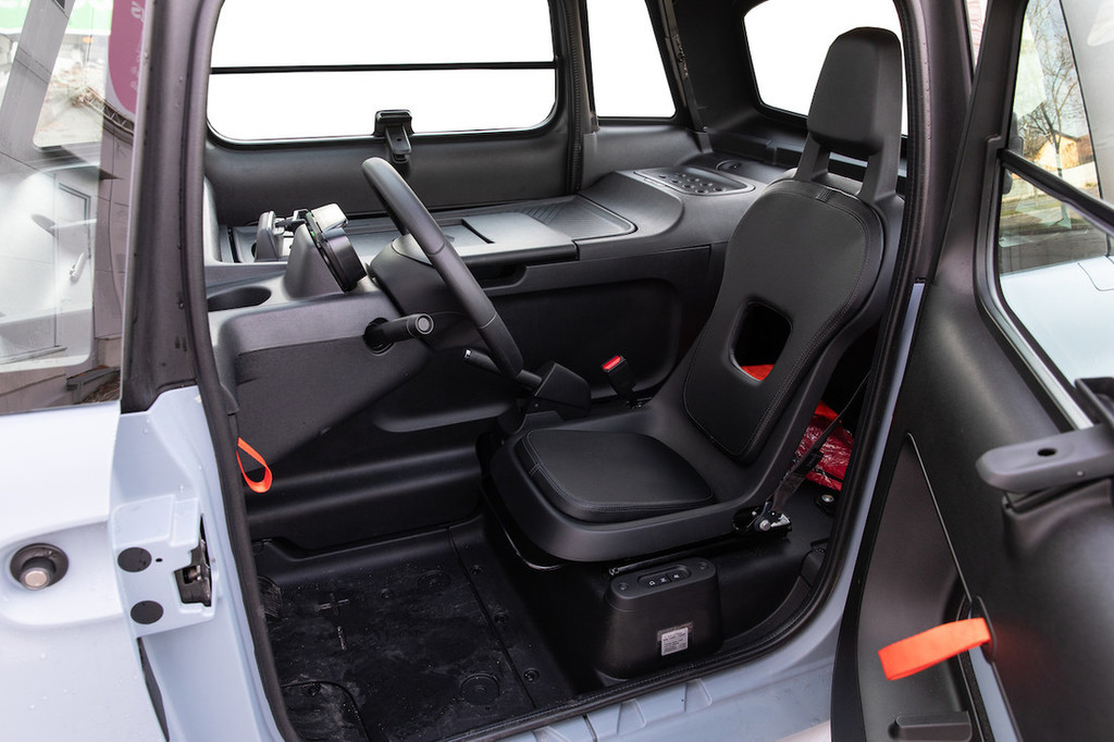je v kabini vroče (steklena streha nima senčnika), oprema je le najnujnejša. Luči, smerniki, brisalec, hupa in … no, to je to. Na priročen nosilec pa lahko namestite mobilni telefon in v predalček nad volanom postavite prenosni zvočnik.