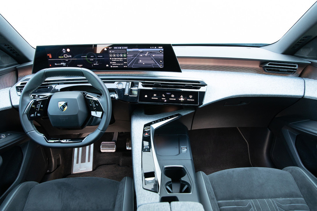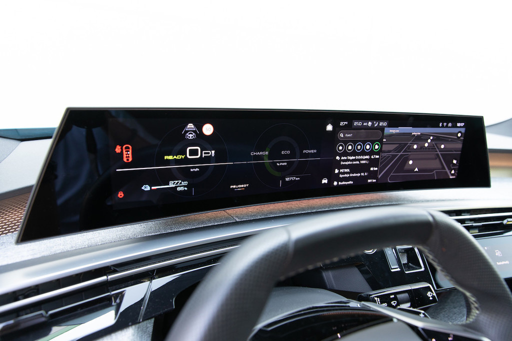 Nič manj drzno, morda celo še bolj kot navzven, je oblikovana notranjost, ki se zdi kot iztegnjeni sredinec vsem minimalistično prečiščenim kabinam električnih tekmecev. Najprej je tu nova generacija Peugeotovega panoramskega i-cockpita z majhnim volanskim obročem in ukrivljenim lebdečim zaslonom premera 53,3 centimetra nad njim. Tam se dogaja praktično vse, saj zaslon združuje tako voznikovo instrumentno ploščo kot osrednji zaslon na desni polovici. Ta je seveda občutljiv na dotik, a ni