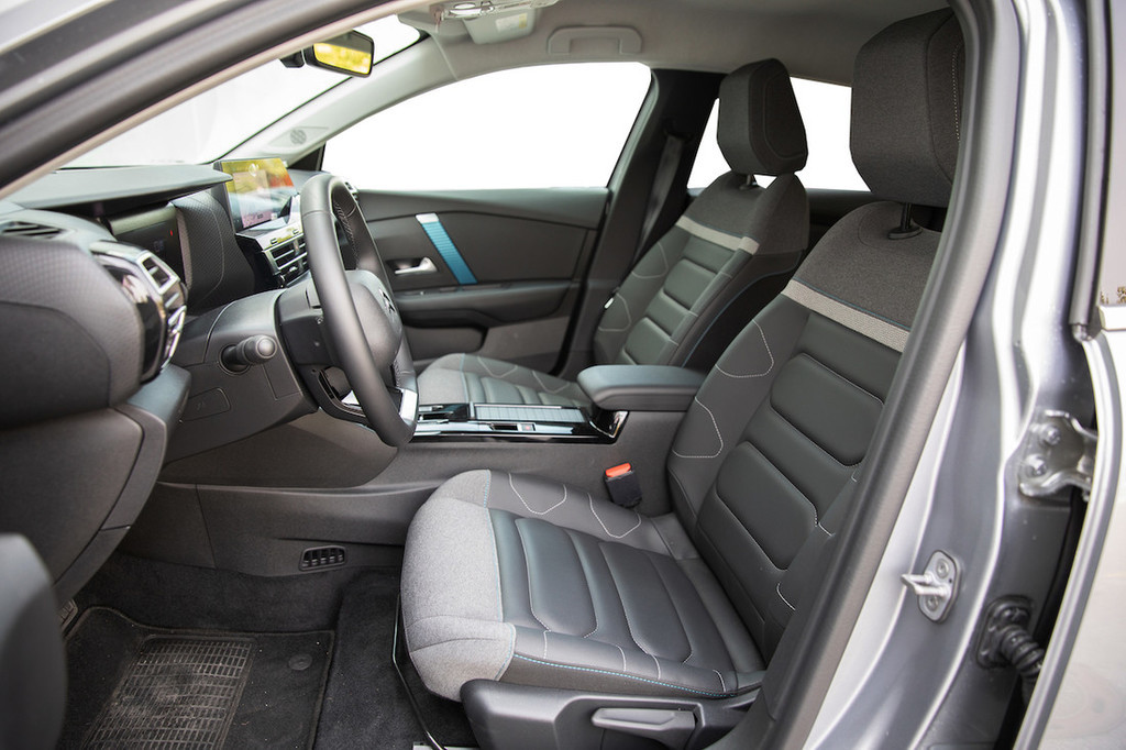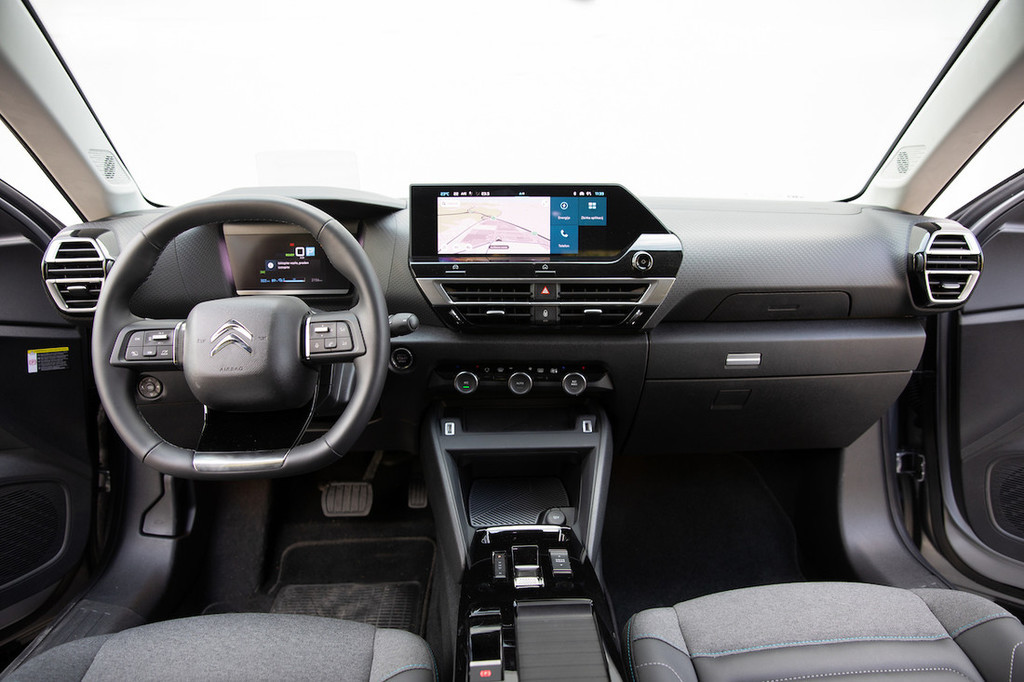 zlepa ne zmanjka. Sicer je sprednji del kabine zasnovan popolnoma enako kot pri običajnih C4 in bencinskem C4 X. Tudi tokrat lahko pohvalimo razmerje med digitalnim in analognim, pri čemer lahko pohvalimo 25,4-centimetrski osrednji zaslon, medtem ko bi bil skromen 12,7-centimetrski informacijski zaslon za voznika lahko nekoliko večji. A je tokrat vtis popravil projekcijski zaslon, pri katerem voznik brez odvračanja pogleda s ceste vidi vse ključne informacije za vožnjo.