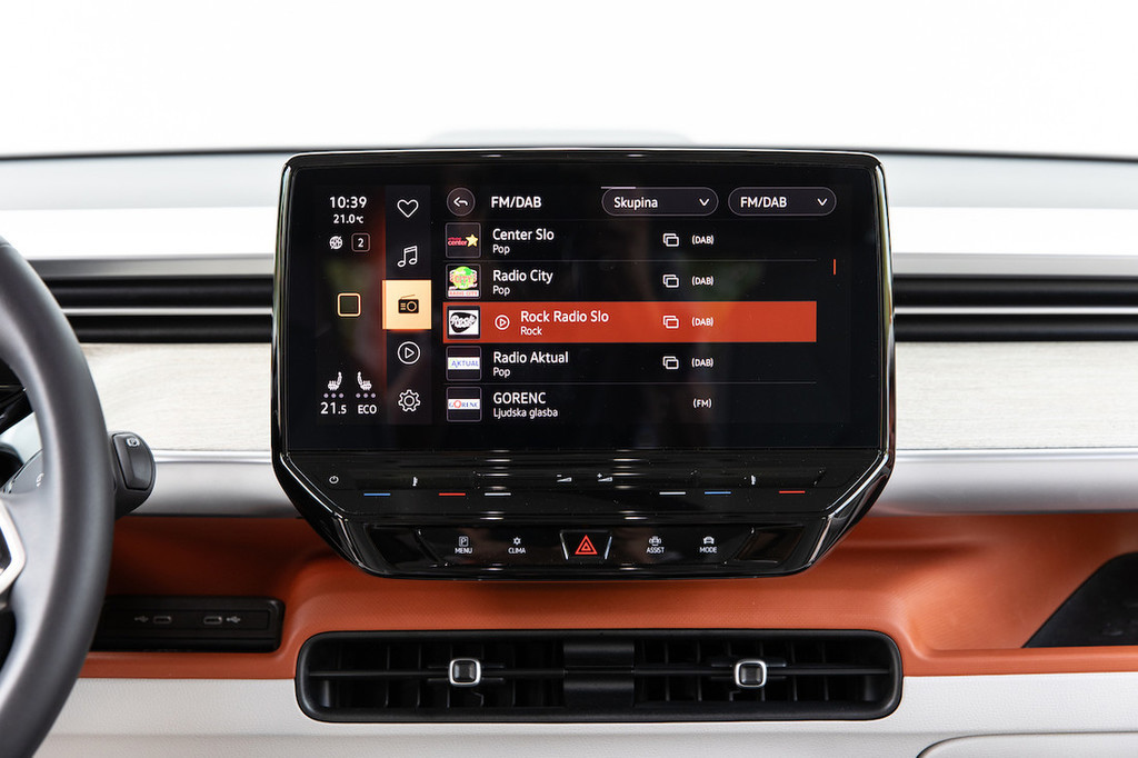 multimedijske naprave in celotnega sistema. Vmesnik, na katerega se je treba malce navaditi, deluje bolj tekoče, kot v prvih predstavnikih družine ID, a še vedno pogrešamo fizične gumbe in stikala, vsaj za upravljanje klimatske naprave. Namesto klasične prestavne ročice je desno ob volanskem obroču nameščeno previsno stikalo, na katerega se brez težav navadimo.