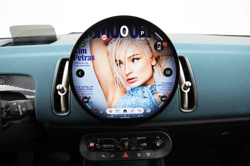 odpovedal – hitrost in osnovni podatki so bili še tam, tudi slika kamere pri vožnji vzvratno, a kak dan (po tem se je sistem sam od sebe spet postavil nazaj) sem moral v toplem sončnem vremenu zdržati s klimatsko napravo, nastavljeno na 24 stopinj Celzija, in z ogrevanim sedežem … Kakor koli, mini ni ne prvi ne zadnji in še zdaleč ne edini, pri katerem se upravljanje osnovnih funkcij prek zaslona dokazuje kot kompromisna rešitev …