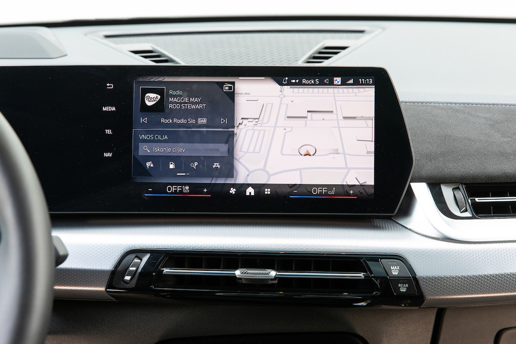 Malce bolj zmoti upravljanje klimatske naprave prek zaslona, saj je notranja arhitektura praktično enaka kot v X1 – torej brez fizičnih stikal za ta namen. Ima pa na sredinski konzoli med sedežema gumb za glasnost in izbiro voznih režimov, žal pa ne tudi vrtljivega vmesnika za upravljanje infotainmenta, kakršnega premorejo večji BMW-jevi modeli. Osrednjo vlogo zavzemata zaslon pred voznikom premera 26,2 centimetra in osrednji zaslon s 27,2 centimetra, ki ima številne aplikacije, vključno z