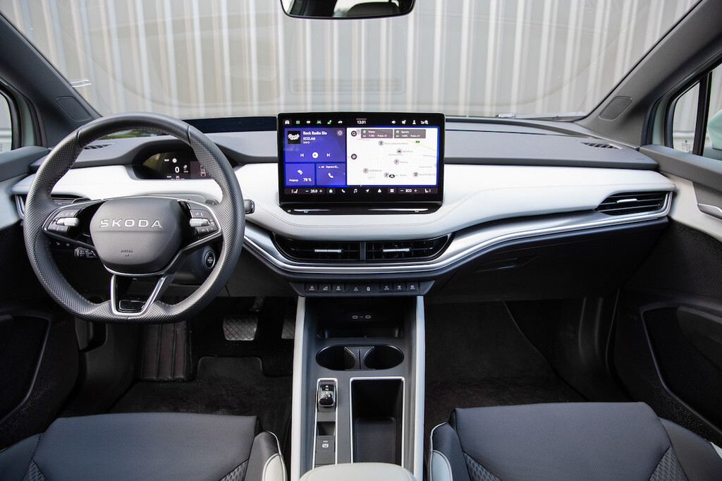 Poznana je tudi postavitev voznikovega delovnega prostora z 12,7-centimetrskim (5-palčnim) zaslonom pred voznikom, ob katerem je na voljo projekcijski zaslon z obogateno resničnostjo. Na sredini je nameščen 33-centimetrski (13-palčni) zaslon na dotik s Škodinim najnovejšim uporabniškim vmesnikom, ki vključuje asistentko Lauro s podporo umetne inteligence ChatGPT. Splošna ergonomija je dobra, a tako kot pri enyaqu bi si seveda tudi tu namesto upravljanja prek zaslona in drsnikov pod njim