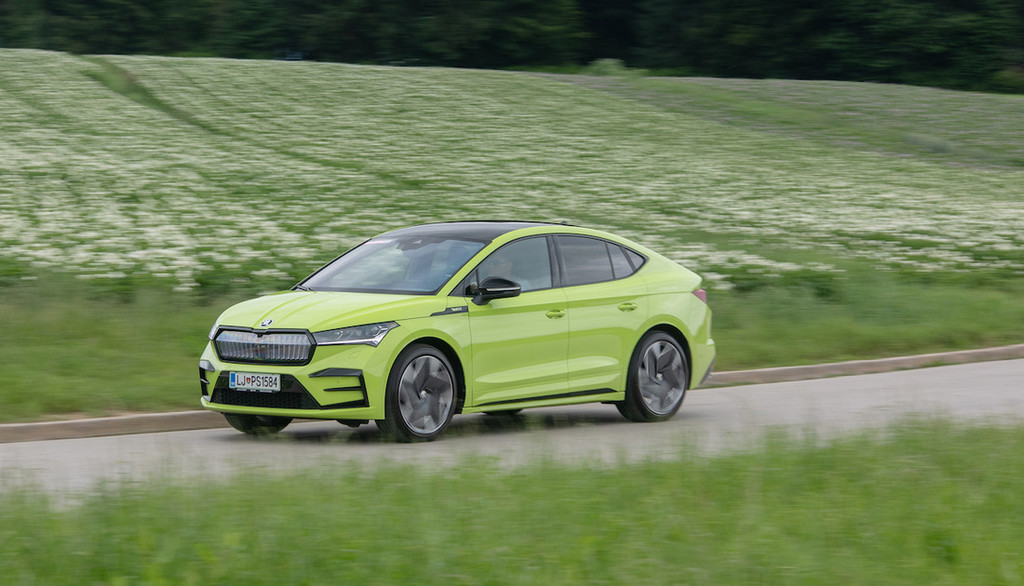 Kakorkoli, vseeno gre za poskočen in pri odločnem pospeševanju zelo živahen avto, ki se v primerjavi z običajnim enyaqom ponaša tudi z nižjim (spredaj za 15, zadaj za 10 mm) in prilagodljivim podvozjem. To je v športnem režimu precej bolj čvrsto in zato se RS skozi ovinke pelje zelo dobro ter z razmeroma malo nagibanja, a kot celota ne pušča prav pretirano športnega občutka, saj gre ne nazadnje za precej težak avtomobil, česar ne more povsem skriti. Tudi volan je vse prej kot športno oster,
