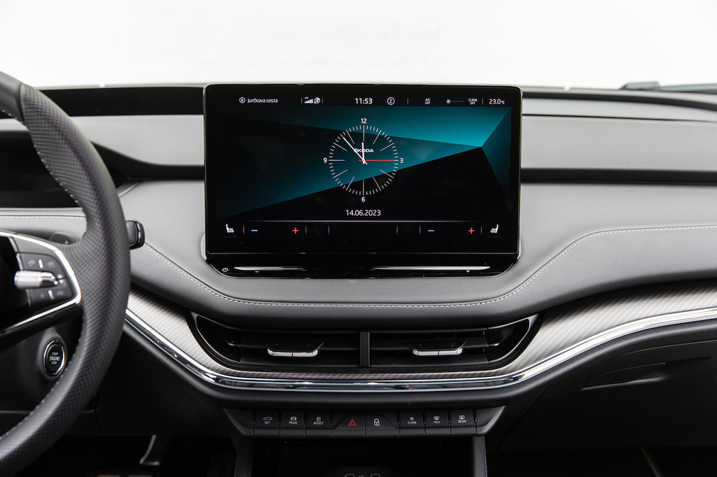 številnimi funkcijami, povezavama Android in Apple ter velikimi in logičnimi ikonami, a z nekaj slabšo odzivnostjo. Tudi drsniki za upravljanje klimatske naprave in glasnosti avdio sistema so neposrečena rešitev.