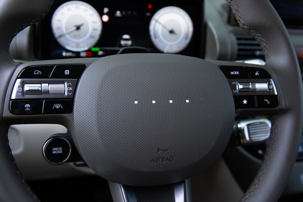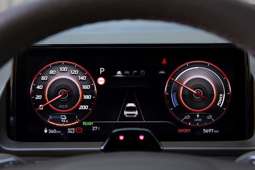 Armaturno ploščo sestavljata dva zaslona premera 26 centimetrov; eden opravlja vlogo merilnikov, prilagojenih potrebam električnega pogona, drugi je za upravljanje infotainmenta in nekaterih drugih funkcij. Kot rečeno, za večino funkcij skrbijo fizična stikala, kar uporabniško izkušnjo povzdiguje na višjo raven. V sklopu mnogih odlagalnih površin je tudi površina za brezžično polnjenje telefona, s seznama doplačil pa tudi 220-voltna vtičnica za napajanje zunanjih naprav, na primer kavnega