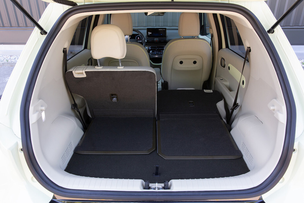 Drzno oblikovana, a kompaktna zunanjost se v notranjosti ne občuti prav močno. Če kje, je nekoliko tesno predvsem v širino, kjer je inster precej ožji od tekmecev. Na sprednji klopi so zato inženirji uporabili zanimivo rešitev skorajda spojenih sedišč brez sredinskega kanala. To mu seveda omogoča električna zasnova, katere največji prostorski zahtevek (baterije) se skriva v dnu in nikakor ne posega v kabinski prostor. Ker tudi zadaj lahko sedita največ dva potnika vštric, je situacija podobna