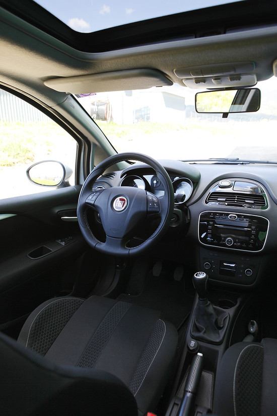 Pikantnost je poudarjena še s ponovno istim obarvanjem okrasnih letvic in kljuk na tapiserijah vrat. Ambientalna osvetlitev, ki sije izpod airbaga na sopotnikovem delu armaturne plošče ter v vratnih odpiralih, ne dosega svojega namena; ledeno bela barva se krega z opečnato barvo merilnikov in vseh stikal, zato vse skupaj izgleda pravzaprav precej ceneno. No, obratno, dober občutek pa vliva steklena streha, sestavljena iz dveh segmentov, pri čemer se prvi za povrh kot strešno okno še na široko odpre. Po drugi strani smo že vsi naveličani puntovega in identičnih Fiatovih potovalnih računalnikov, ki z grobim matričnim prikazovalnikom in s premikanjem prikaza podatkov samo v eno smer izpade zastarelo. Podobno kot nepreglednost tipk klimatske naprave med vožnjo ponoči.