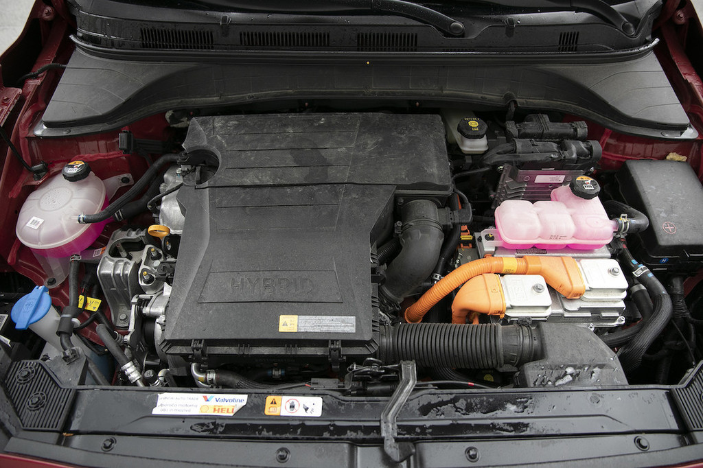 Hibridna kona lahko le na elektriko vozi zelo kratek čas, saj ima iz ioniqa izposojen pogonski sklop le 1,56-kWh baterijo. Večino časa deluje 1,6-litrski bencinski motor z močjo 77 kW (105 KM), pomaga pa mu elektromotor z močjo 32 kW. Tako je na voljo največ 104 kW (141 KM), ki jih k sprednjemu kolesnemu paru pošilja 6-stopenjski robotiziran menjalnik z dvojno sklopko. Čeprav hibridov ne enačimo z vozno dinamiko, je vožnja s takšno kono prav zaradi izbire menjalnika lahko prav živahno