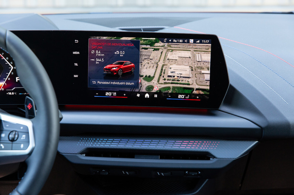 osrednjega zaslona (uporabnega vmesnika v obliki vrtljivega gumba med sedežema žal ne premore), vključno s klimatsko napravo, kar med vožnjo zahteva umik pogleda s ceste in ciljanje ikon na spodnjem robu zaslona. Ta meri 27,2 centimetra in prek številnih menijev omogoča mnoge nastavitve, ki pa jih zaradi logike računalniške tablice bolj kot ne lahko izbirate le pri parkiranem vozilu (med vožnjo dostop do njih ni prav intuitiven). Tesno sorodstvo z enko se kaže še v kakovosti materialov in